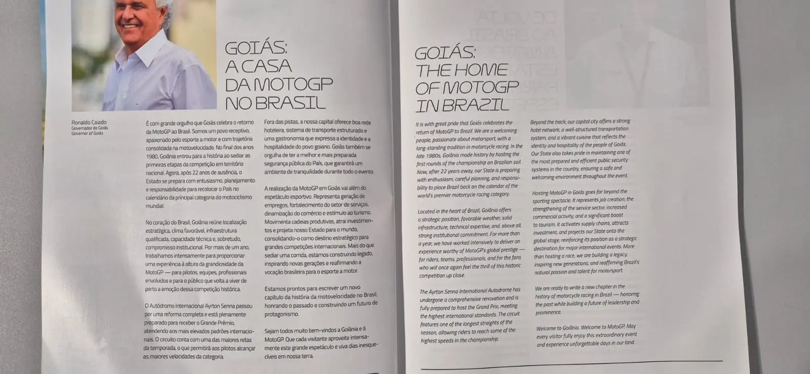 A revista oficial do MotoGP destacou Goiás como a casa da motovelocidade no Brasil. Em uma das páginas da publicação, o governador Ronaldo Caiado (PSD) comemorou o retorno da principal categoria do motociclismo ao país, ressaltando o papel estratégico de Goiânia e o legado que o evento deixará para o futuro do Estado.