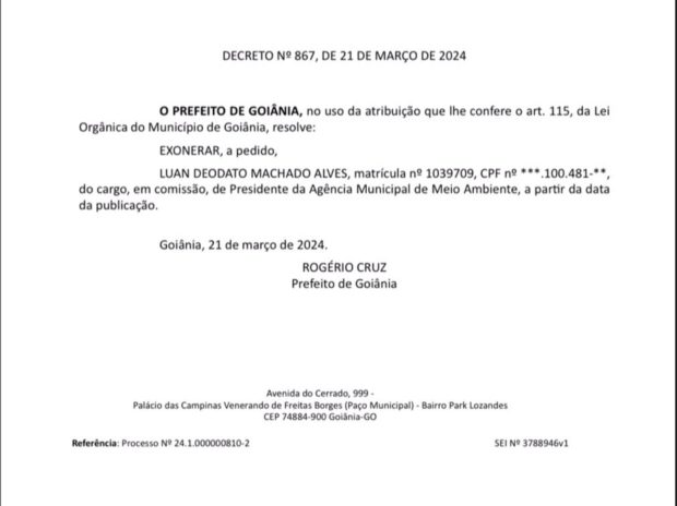 Após operação da Polícia Civil de Goiás (PCGO) na última quarta-feira, 20, o prefeito Rogério Cruz (Republicanos) resolveu exonerar o titular da Agência Municipal do Meio Ambiente (Amma). A agência era um dos alvos da investigação por crimes de modificação irregular de contratos, peculato, constituição de organização criminosa e corrupção ativa e passiva. O decreto foi publicado na última quinta-feira, 21, e destaca que exoneração teria sido pedido de Luan Deodato Alves.