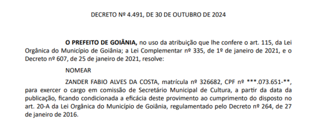 Após tentar eleição para vereador em Goiânia e não obter sucesso, o ex-secretário de Cultura de Goiânia retorna para a pasta. Em meio à crise no setor artístico, Zander Fábio assumiu a Secretaria Municipal de Cultura (Secult) em abril de 2021. Deixou a pasta em abril de 2024 para se candidatar a vereador, sob denúncia de não pagamento do cachê de artistas que participaram de eventos promovidos pela Secretaria. Agora, no fim de outubro de 2024, Zander retorna à Secult.