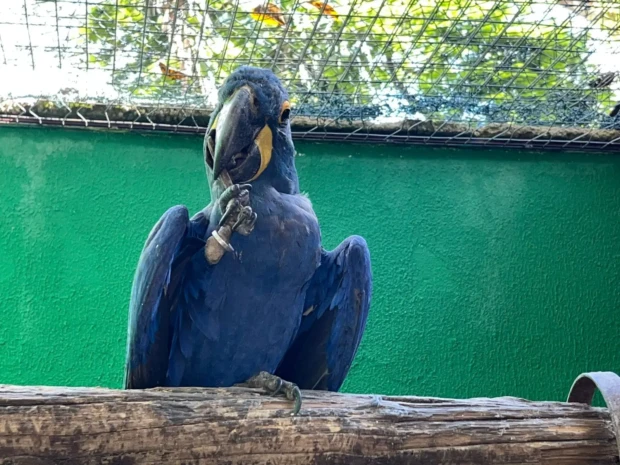 Lembrando que a arara-azul-grande vive principalmente no Pantanal, no Cerrado e em partes da Amazônia, e pode chegar a cerca de um metro de comprimento. Além disso está em extinção, classificada como vulnerável.