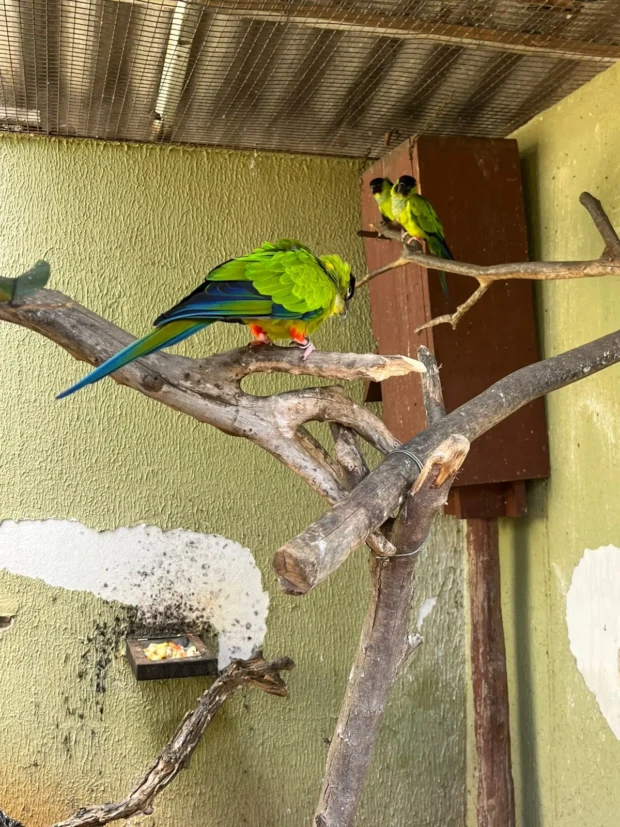 Os filhotes, que são dois machos, nasceram em agosto e permanecem sob os cuidados dos pais, como é comum para a espécie. O período de cuidado pode durar cerca de um ano, segundo a veterinária, o que influencia diretamente no intervalo entre as reproduções. Ela ressalta que as araras-azuis costumam se reproduzir a cada dois anos.