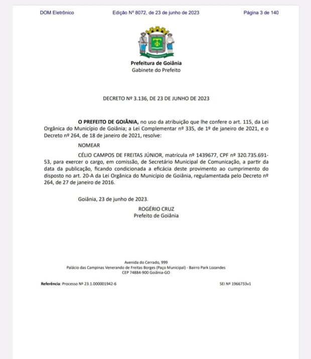 Célio Campos de Freitas Júnior foi designado pelo prefeito de Goiânia, Rogério Cruz (Republicanos), como o novo responsável pela Secretaria Municipal de Comunicação. O decreto oficial foi publicado no Diário Oficial do Município (DOM) na tarde desta sexta-feira, 23.