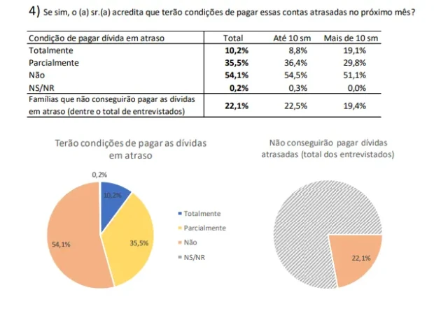 Mais de metade (54,1%) afirmou que não tem condições de pagar as dívidas em atraso. Os que podem pagar parcialmente são 35,5%. Os que podem pagar totalmente suas dívidas são 10,2% (19,1% dos que ganham mais de 10 salários mínimos podem pagar totalmente suas dívidas).