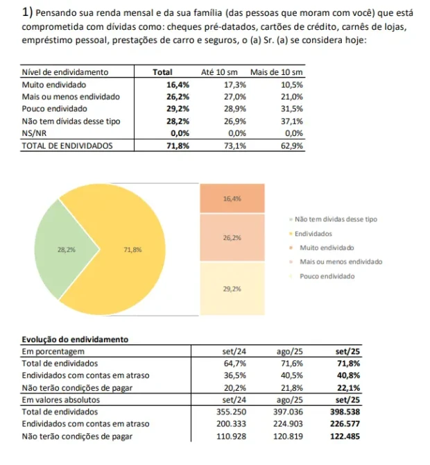 Segundo o levantamento, 16,4% dos entrevistados se consideram muito endividados, enquanto 29,2% afirmam estar pouco endividados. Apenas 28,2% disseram não ter dívidas. Entre as famílias com renda de até dez salários mínimos, a taxa de endividamento sobe para 73,1%.