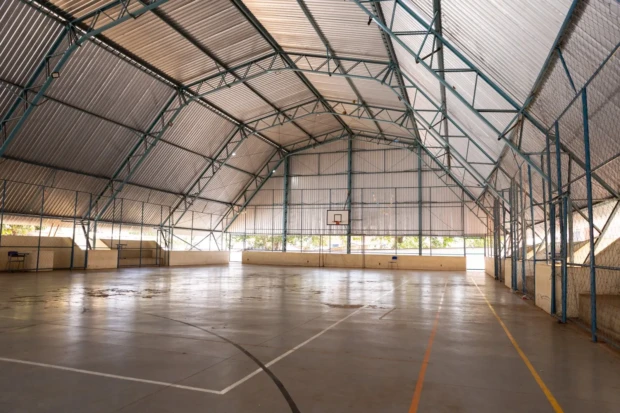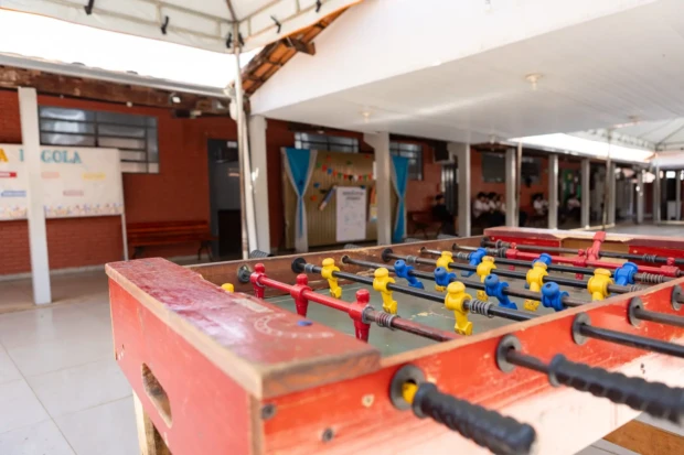 O espaço vazio é preenchido por uma infraestrutura de alternativas: pebolim, tênis de mesa, quadra, e acesso pedagógico à internet através de Chromebooks fornecidos pela escola.
