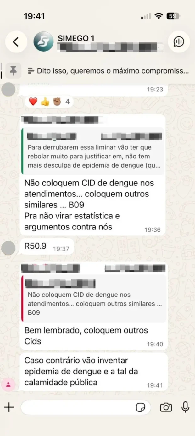O objetivo da categoria é impedir a constatação de epidemia de dengue na capital, para prejudicar o recebimento de recursos federais para o enfrentamento à doença e impedir que a situação epidemiológica sirva de base para decretação de calamidade pública. Em mensagem de texto enviada no grupo, uma médica sugere “Não coloquem CID de dengue nos atendimentos para não virar estatística”. A mensagem é corroborada por outra profissional que diz “Bem lembrado, usem outros CIDs”.