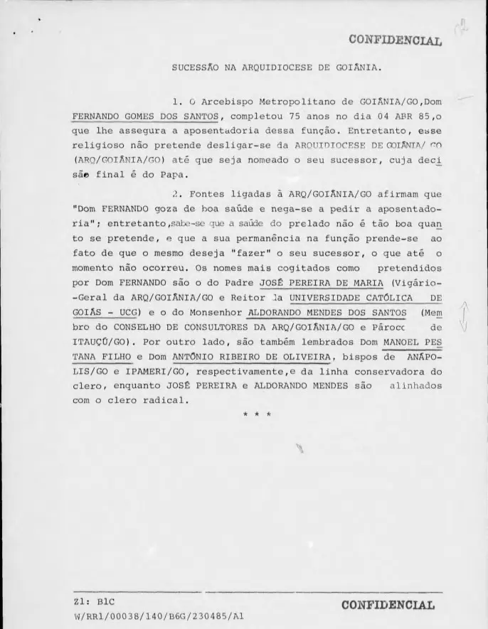 Na mesma época, Goiânia se preparava para a primeira sucessão em sua Arquidiocese. Dom Fernando Gomes dos Santos, nosso primeiro Arcebispo, no dia 4 de abril de 1985, completava 75 anos e, de acordo com as regras da Igreja Católica, deveria se aposentar. Ele enviaria uma carta ao Papa João Paulo II apresentando sua renúncia e aguardar a escolha do seu sucessor. Os agentes do SNI estavam atentos à escolha do novo Arcebispo e produziam relatórios com os possíveis nomes como Padre José Pereira de Maria, reitor da Universidade Católica de Goiás (atual PUC-Goiás) e Dom Antônio Ribeiro de Oliveira, bispo de Ipameri, interior de Goiás.