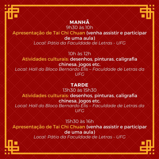 Por meio do Instituto Confúcio de Medicina Chinesa, a Universidade Federal de Goiás (UFG) programou uma série de atividades comemorativas para a chegada do Ano Novo Chinês, celebrado no mundo todo no último domingo, 22. A agenda tem programação matutina e vespertina na quarta-feira, 25, com ações realizadas na Faculdade de Letras do Campus Samambaia, com a intenção de promover a cultura da China.