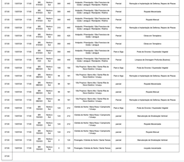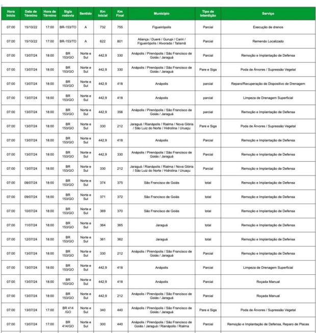 Durante esta semana, as rodovias BR-153, BR-414 e BR-080, que integram o Sistema Anápolis-Aliança do Tocantins, sob administração da Ecovias do Araguaia, passarão por reformas. Estão programadas intervenções como remendos localizados, supressão vegetal, implantação de defensa metálica e melhorias na sinalização. Veja o cronograma de obras ao fim da matéria.
