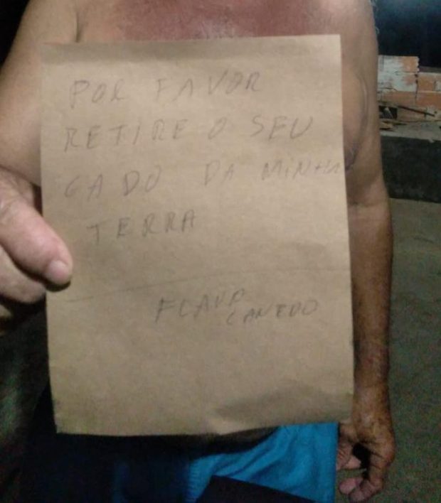 Segundo relatos, sem apresentar nenhum documento judicial aos moradores, Flavio afirmou ser dono das terras e que irá tomar posse do local, deixando ainda bilhetes às famílias para que retirarem seus animais da área. “Ele andou em algumas parcelas da terra, não andou em todas, não. Ele estava com uma caminhonete, foi na casa do meu vizinho e entrou lá. O vizinho questionou o que ele estava fazendo lá e ele falou: ‘eu estou olhando as minhas terras’. Na outra casa, o morador não estava e ele deixou um bilhete”, explicou a moradora, que optou por não se identificar.