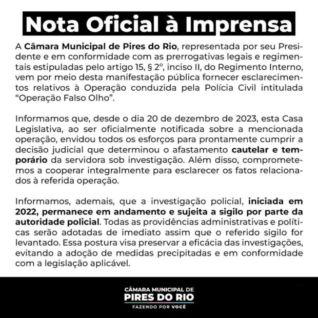 Em nota, a Câmara de Pires do Rio declarou que desde o dia 20 de dezembro, quando foi notificada sobre a operação, envidou todos os esforços para cumprir a decisão judicial que determinou o afastamento cautelar e temporário da servidora sob investigação. “Informamos, ademais que a investigação policial, iniciada em 2022, permanece em andamento e sujeita a sigilo por parte da autoridade policial” (confira a íntegra abaixo).