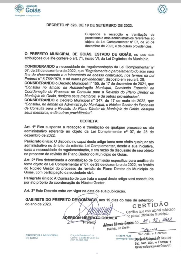 O prefeito da cidade de Goiás, Aderson Gouvea (PT), assinou um decreto suspendendo a recepção e tramitação dos processos da lei complementar n° 07, que permite a construção de condomínios ilegais em áreas de preservação ambiental. Ativistas ambientais, no entanto, dizem que a atitude é uma espécie de “cortina de fumaça” devido a repercussão negativa da legislação.