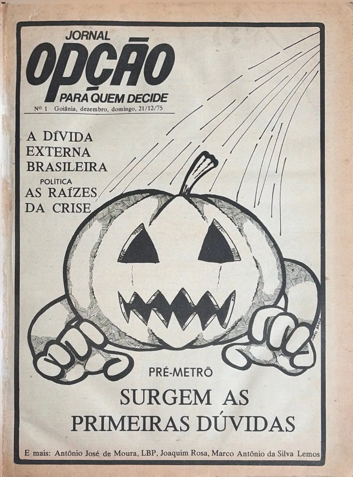 No dia 21 de dezembro de 1975, nascia o Jornal Opção. Um dos veículos mais relevante de Goiás completou 50 anos. Para comemorar seu meio século de existência, a cada edição de domingo, até o fim do ano, o leitor poderá ver as capas icônicas que contam a história do Estado. Nesta publicação, o leitor poderá ver a capa da edição número 1, que, naquela época, já fomentava o debate sobre a viabilidade ou não do (pré-)metrô em Goiânia.