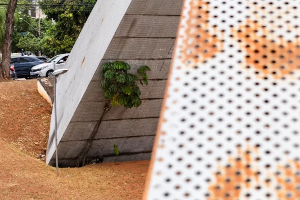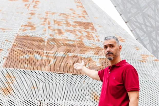 Um dos exemplos mais emblemáticos citados por Da Mata é o monumento metálico da Praça do Ratinho, que apresenta corrosão nas placas metálicas e ausência total de manutenção. “Imagine se houver uma ruptura. O risco para os usuários é grave.”