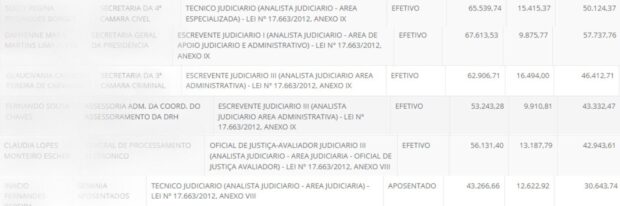 Além dos juízes e desembargadores, secretários, escrivãos, técnicos administrativos, escreventes e assessores também recebem salários acima do teto. O Governo de Goiás alega que isso acontece por ‘problemas para suprir posições de chefia’. Confira alguns salários desses servidores no print retirado do site Transparência: