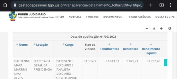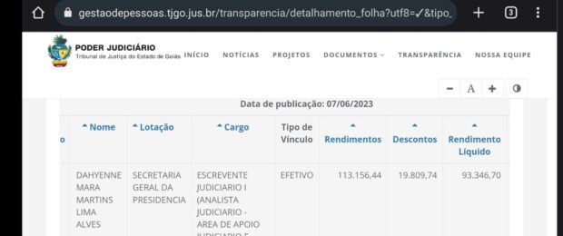 A escrevente, lotada na Secretaria Geral da presidência do TJ-GO, Dahyenne Mara Martins Lima Alves, chegou a ganhar mais de R$ 90 mil líquido por mês. O valor foi consultado no site Transparência e refere-se ao pagamento do mês de junho. Confira: