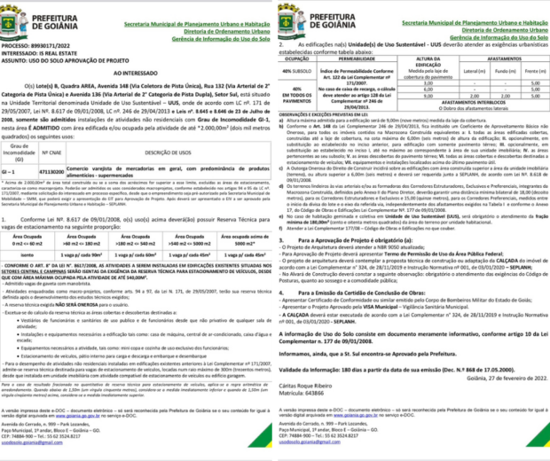 A área de 5 mil metros quadrados onde foram derrubadas 86 árvores – um terreno que pertencia à União e que abriga nascentes nos cruzamentos das Avenidas 136 com as ruas 132 e 148, no Setor Sul, em Goiânia – pode abrigar um supermercado. A informação consta no documento de uso de solo – obtido com exclusividade pelo Jornal Opção – emitido pela Prefeitura de Goiânia há quase um ano, em 27 de fevereiro de 2022, a pedido da empresa IS Real Estate com parecer favorável à construção no local de um “comércio varejista de mercadorias em geral, com predominância de produtos alimentícios – supermercado”.