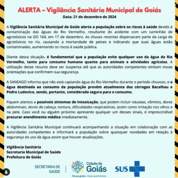 No documento publicado, informam ainda que a Saneago garante que a água destinada ao abastecimento da população não vem do curso contaminado. Sem informar quais medidas estão sendo adotadas para controle das substâncias despejadas no Rio Vermelho, a Vigilância Sanitária pede para que a população fique atenta a quaisquer sinais de intoxicação (como tontura, dor de cabeça, dificuldade respiratória, irritação nos olhos ou na pele…) e busque ajuda médica caso os percebam.