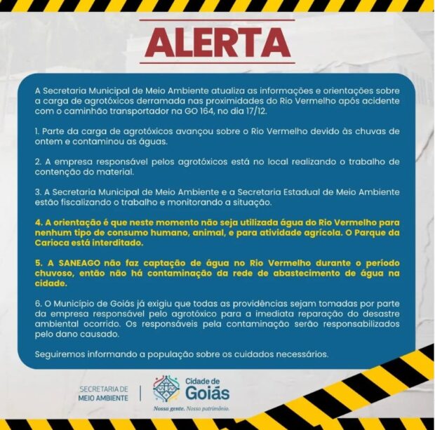 No alerta feito pelo Núcleo Gwatá, se fala em “prováveis e iminentes danos à saúde e ao meio ambiente” cuja causa apontada foi a “contaminação causada por agrotóxicos dispersados nas proximidades do Parque da Carioca” que aconteceu após acidente com caminhão que carregava os produtos. O veículo se acidentou na GO-164 na última terça-feira, 17. Nas imagens compartilhadas pelo grupo da UEG é possível ver peixes mortos à beira do Rio Vermelho e restos das embalagens dos agrotóxicos.