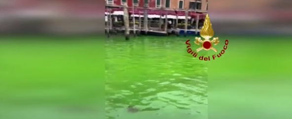 O Canal de Veneza apresentou, neste domingo, 28, águas exibindo um tom verde fluorescente nas proximidades da ponte de Rialto.