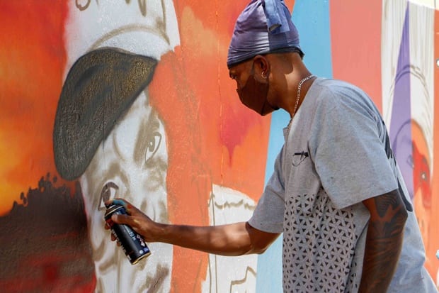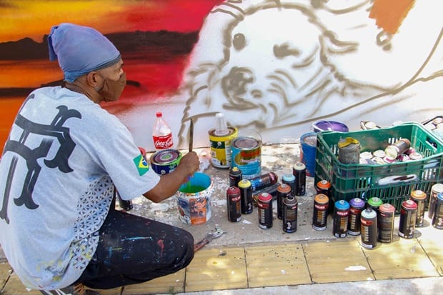 Artista Decy grafita muro do Sesc Goiás de 100 metros de largura