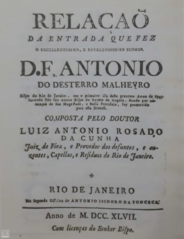 É desse período o primeiro livro impresso no Brasil, quase 300 anos depois da Bíblia de Gutemberg, a primogênita publicação europeia. Trata-se do livro “Relação da entrada do Bispo do Rio de Janeiro” (Rio de Janeiro, 1747), de Luiz Antônio Rosado da Cunha, editado na Segunda Officina de Antonio Isidoro da Fonseca. Como a existência de tipografia na colônia era terminantemente proibida pelo rei de Portugal, o aparecimento do citado opúsculo é creditado a um cochilo das autoridades portuguesas. Corrobora a interpretação o fato de Dom João V, ao tomar ciência do acontecido, ter determinado o confisco do prelo e a apreensão da obra. Aliás, o mesmo destino sucedido com “Cultura e Opulência do Brazil”, de autoria do padre Antonil, impressa no exterior em 1711 e só republicada no país 126 depois.