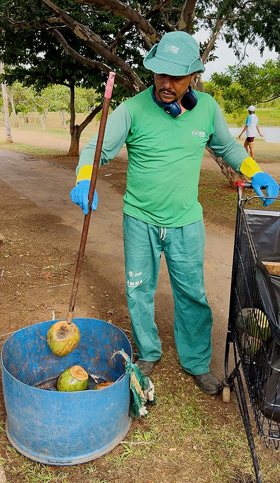 Paulo Henrique falou dos que bebem água de coco e não têm a decência de levar o coco a uma lixeira, dos que abrem uma garrafa de água mineral, ou um suco, ou um refrigerante, e fazem o mesmo. Me contou que, até dentro do lago do parque, são jogados cocos e outros resíduos. Esse pessoal passa a impressão de que vê o parque como um quintal sem dono ou uma espécie de casa da mãe Joana. Que fique bem claro que Paulo Henrique não foge à tarefa que lhe compete. É um cumpridor de tarefa.