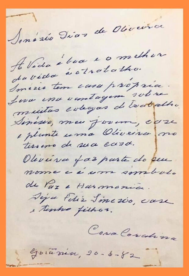 Dedicatória de Cora Coralina para Sinésio Dioliveira