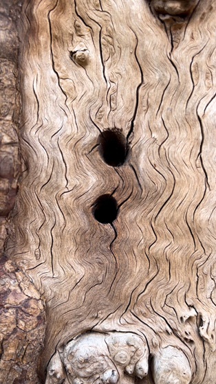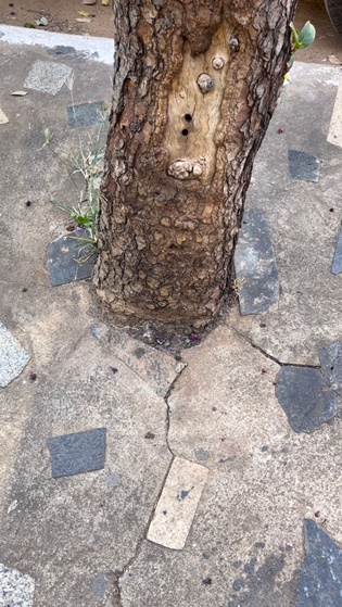 Segundo Ângela, além de estrangulada pelo concreto da calçada, a espécie foi também envenenada. Na base do tronco, há dois furos feitos com furadeira para colocação de veneno, e, na parte central do seu tronco, há uma cavidade escura: cor certamente resultante de algum produto químico colocado para dar fim à vida da pobre árvore, cuja função na natureza é gerar para nós (bichos da Terra tão pequenos) benefícios que ela mesma não usufrui.