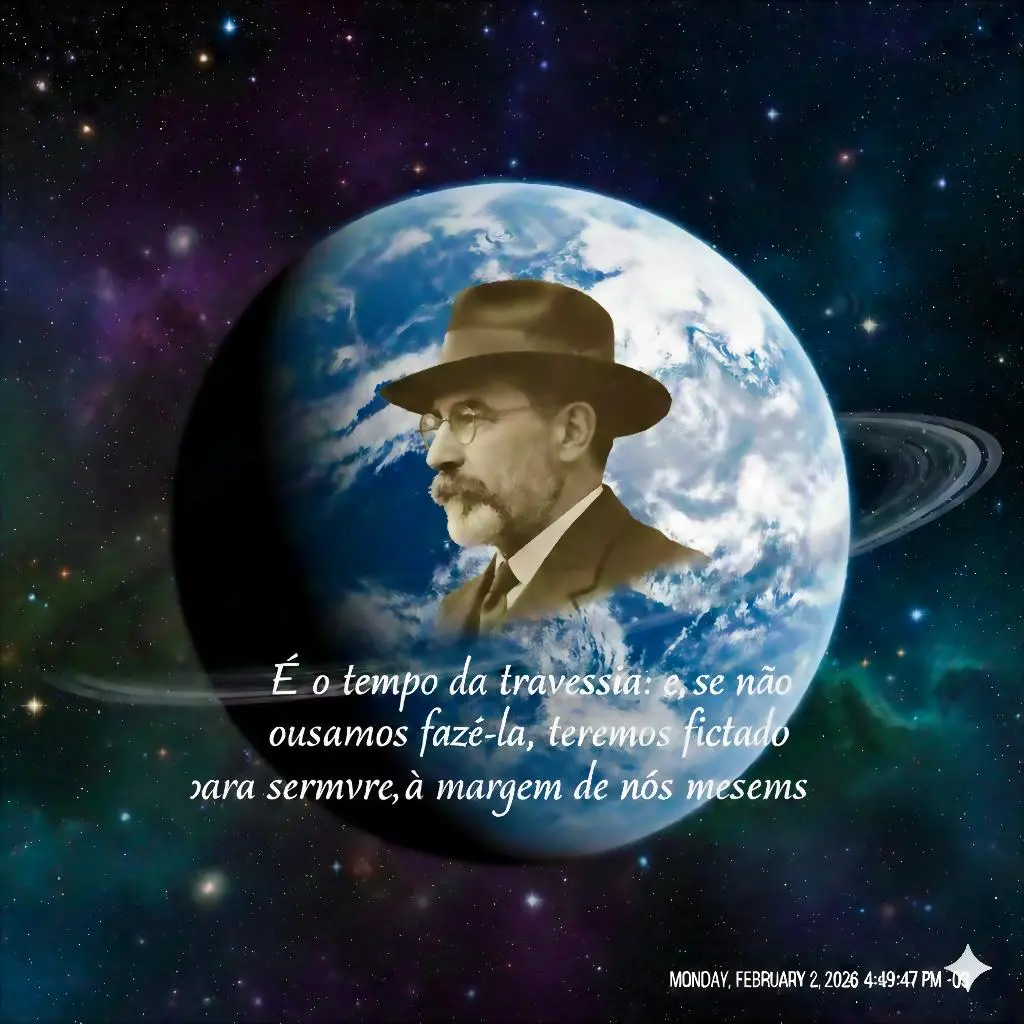 A frase popularmente atribuída a Fernando Pessoa — “É o tempo da travessia: e, se não ousarmos fazê-la, teremos ficado, para sempre, à margem de nós mesmos” — sintetiza essa necessidade de transformação. Ainda que não seja uma citação literal de suas obras publicadas, ela reflete o espírito de seus textos sobre mudança, ruptura e autoconhecimento. Em O Livro do Desassossego, Pessoa advertia sobre o risco de permanecer preso a padrões repetitivos: “Tudo me aborrece: exceto a mudança. Tenho medo de permanecer sempre o mesmo” (Pessoa, fragmento 2085, heterônimo Bernardo Soares). A travessia, portanto, é simultaneamente interior e exterior: é um ato de coragem individual que se projeta na sociedade e na história.