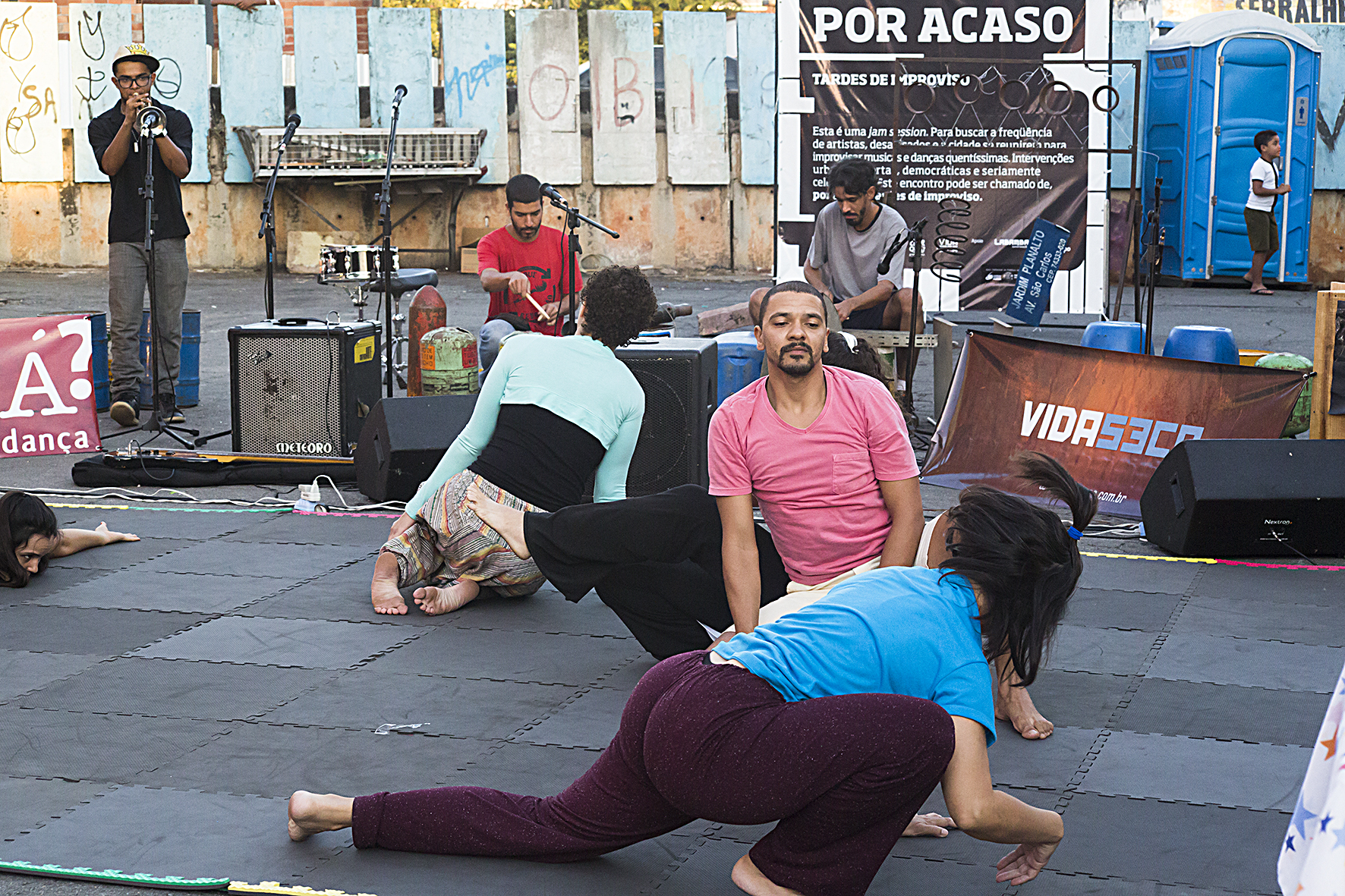 “O ‘Por Acaso’ é nosso melhor brinquedo, pois conseguimos a partir do ritual –– temos um tatame, um jeito de adentrar –– ocupar um espaço urbano da maneira que ocupamos”, conta deste espaço livre, aonde regras tácitas vão se estabelecendo. De quem ali já improvisou, seguem as (minhas) próximas palavras: “É como se fosse uma liberdade que respeita outra liberdade. E elas estão dentro de uma proposta de experimentar, improvisar, de dançar. Tem muito disso, de troca de liberdades, que vão se encontrando. E ambas têm o seu lugar”.