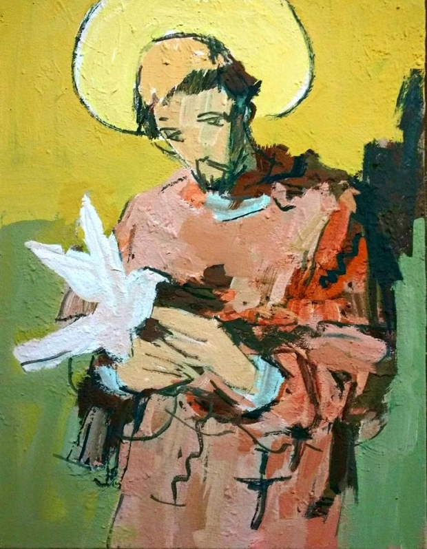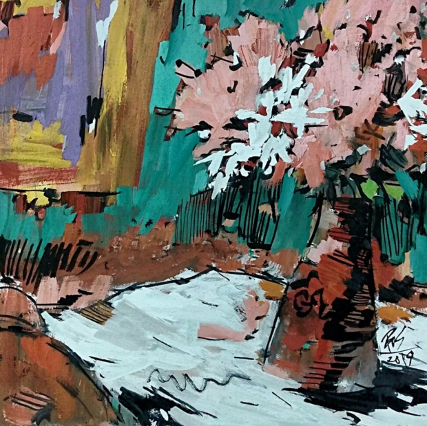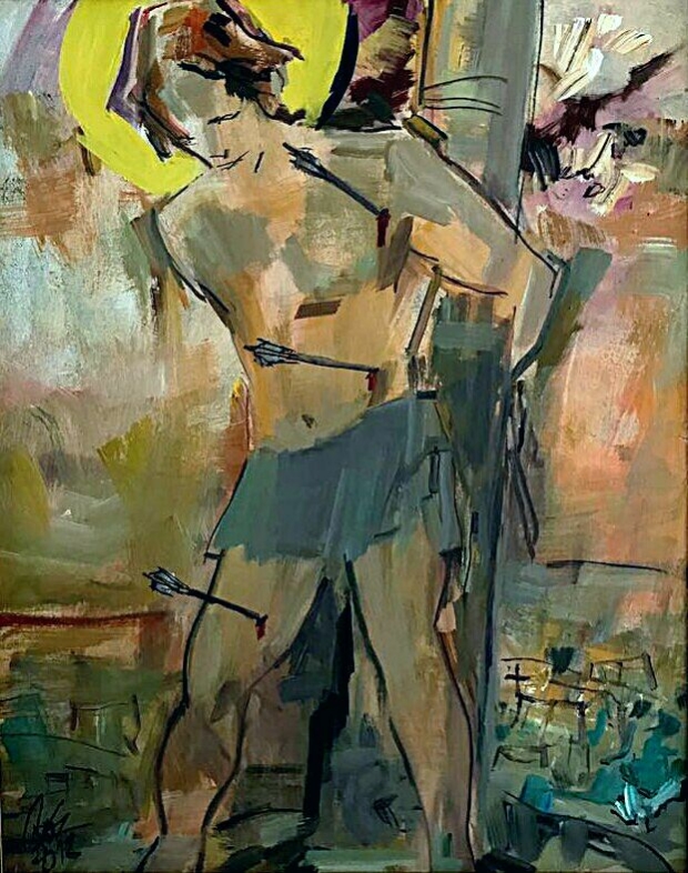 Na primeira fase, nos deparamos com seu lado figurativo, deslumbrado pelo contexto da mitologia. Em seguida, o artista encontra aquela que seria sua paixão mais constante — a iconografia, pintando santos, Dom Quixotes e palhaços. Ora mais expressionista, ora mais impressionista (ou, como diz um pintor, “roosnista”). O artista, então, retorna ao figurativo e o descontrói na terceira fase. Para, logo em seguida, se deparar com a potencialidade do abstracionismo. Tendo absorvido também dos fauvistas as cores fortes e alegres para seus personagens icônicos. Pincelando referências de outros pintores, com sua linguagem idiossincrática. Misturando influências e criando seu próprio sendeiro.