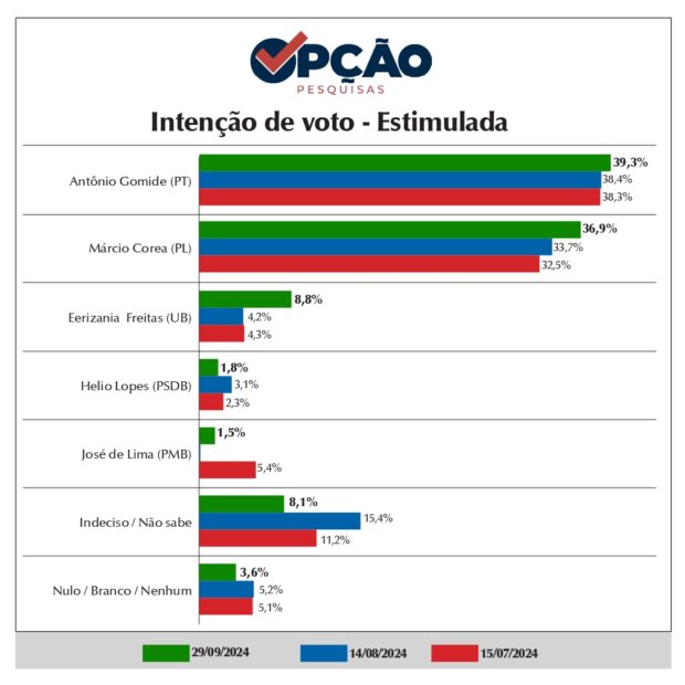 O Opção Pesquisas foi às ruas de Anápolis entre os dias 19 e 22 de setembro para realizar 1.203 entrevistas presenciais que revelaram as intenções de voto dos candidatos a prefeito. O levantamento mostrou que Antônio Gomide (PT) tem 39,3% das intenções de voto; seguido por Márcio Corrêa (PL), que tem 36,9%; Erizania Freitas (UB), com 8,8%; Hélio Lopes (PSDB), com 1,8%; José de Lima (PMB), com 1,5%. Indecisos são 8,1% e nulos e brancos somam 3,6%.
