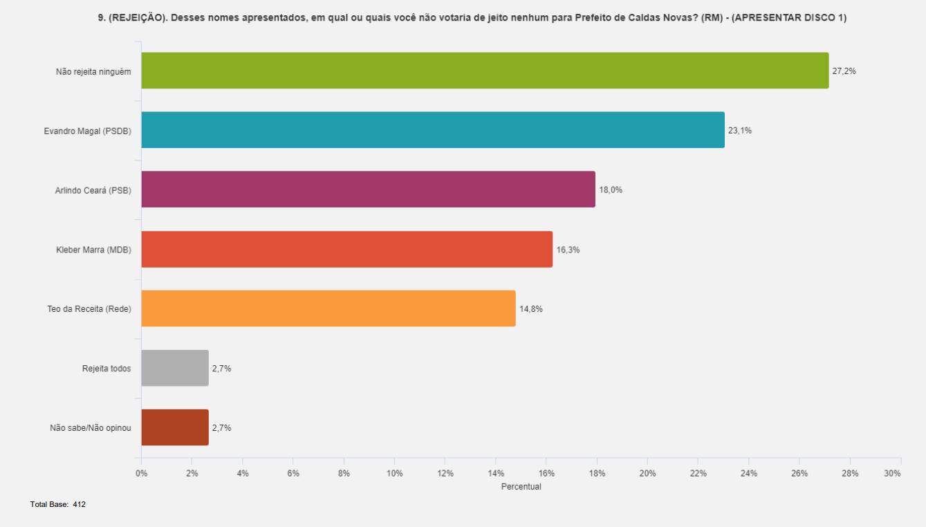 Em 412 entrevistas presenciais, os pesquisadores questionaram: “Em qual destes candidatos você não votaria de jeito nenhum para prefeito de Caldas Novas?”. Parte do eleitorado (27,7%) afirma não rejeitar candidato algum. Evandro Magal é rejeitado por 23,1% do eleitorado. Arlindo Ceará (PSB) tem rejeição de 18%. Kleber Marra não receberia votos de 16,3% do eleitorado. Teo da Receita (Rede) é rejeitado por 14,8%. Aqueles que rejeitam a todos os candidatos são 2,7%. Os que não sabem ou não opinaram são 2,7%.
