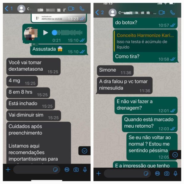 “Procurei uma dermatologista que disse que é uma provável sequela. Ela [Karina] se apresentou como biomédica, me deu toda a segurança que iria dar certo. Quando surgiram as complicações, no mesmo dia, ela nunca mais me recebeu. “Só ficava passando mensagem pelo WhatsApp, ora falava que era ela, ora se dizia secretária da doutora. Dizia sempre que era normal e que iria passar’”, afirmou.