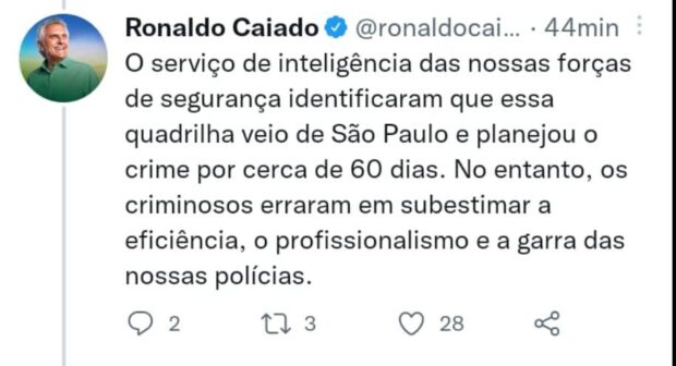 O governador Ronaldo Caiado usou as redes sociais para exaltar o trabalho da polícia. Ele também informou que os criminosos são do Estado de São Paulo, tendo planejado o crime por mais de dois meses.