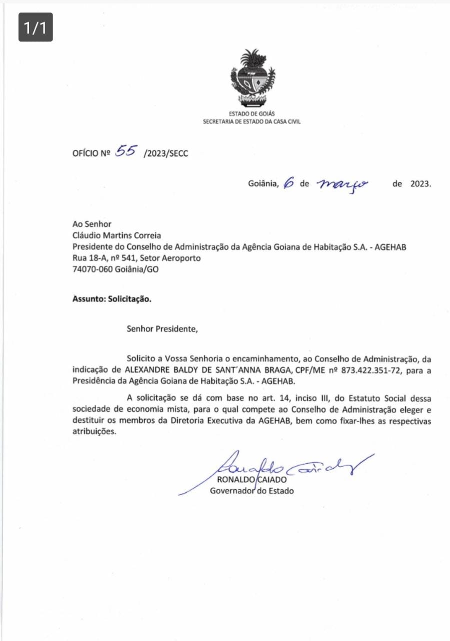 Decreto assinado hoje, 6, pelo governador Ronaldo Caiado indica o ex-ministro das Cidades Alexandre Baldy para a presidência Agência de Habitação de Goiás (Agehab). O ex-deputado federal é presidente estadual do Progressistas.