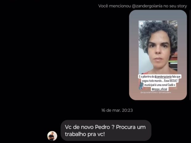 Além disso, os artistas reclamam de não terem recebido nenhum posicionamento oficial da Prefeitura de Goiânia. Os retornos foram feitos pelas redes sociais. Em uma das respostas, Zander Fábio ainda questiona a cobrança, dizendo “procura um trabalho pra vc (sic.)“. Veja abaixo.