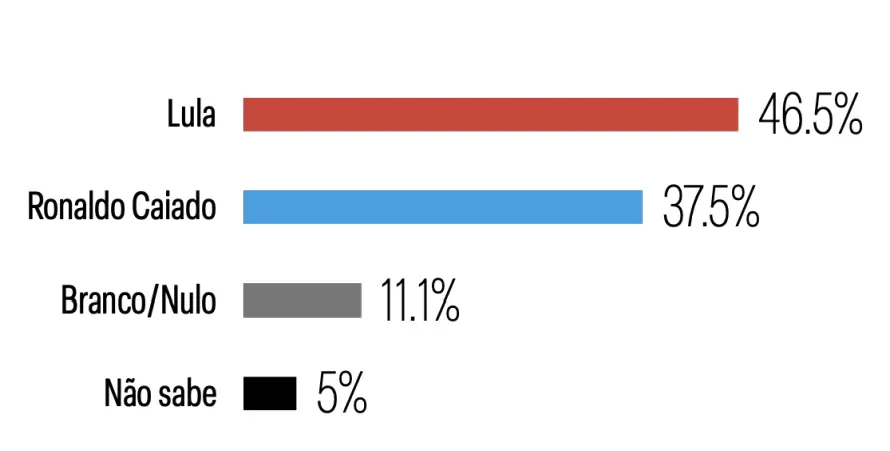 No cenário estimulado de segundo turno testado pelo levantamento, Lula registra 46,5% das intenções de voto, enquanto Caiado aparece com 37,5%. Outros 11,1% dos entrevistados afirmaram que votariam em branco ou nulo, e 5% disseram não saber em quem votariam.