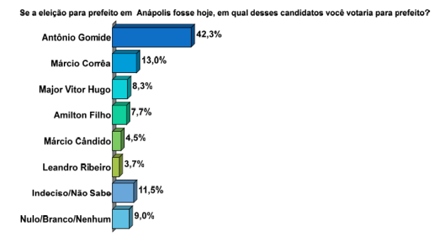 No segundo cenário, Antônio Gomide tem 42,3% dos votos e Márcio Corrêa tem 13%. Major Vitor Hugo (PL) tem 8,3%; Amilton Filho (MDB) tem 7,7%; Márcio Cândido tem 4,5%; Leandro Ribeiro (PP) tem 3,7%. Os indecisos representam 11,5% dos eleitores e os que pretendem votar branco ou nulo, 9%.