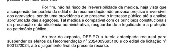 “A decisão liminar concedida pelo Tribunal demonstra que os argumentos apresentados pela defesa, como a ausência de estudos técnicos adequados e potenciais violações à Lei de Responsabilidade Fiscal, foram devidamente reconhecidos como questões urgentes e relevantes. A suspensão do edital de licitação assegura que os atos administrativos sejam conduzidos em conformidade com os princípios da transparência, eficiência e planejamento previstos na Constituição e na legislação vigente”, afirmou.