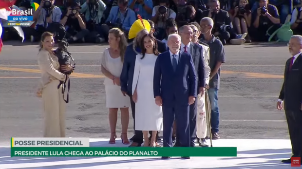 O presidente da República, Luiz Inácio Lula da Silva (PT), subiu a rampa do palácio do Planalto e recebeu a faixa presidencial do “povo brasileiro”, simbolizado nas figuras de uma criança negra, de uma pessoa com deficiência, do cacique Raoni – liderança indígena reconhecida internacionalmente – e de catadora de papel, que passaram a faixa de mão em mão. Na caminhada pela rampa, Lula guiou pela coleira a cachorrinha Resistência, adotada pela primeira dama Janja em Curitiba, onde Lula esteve preso.