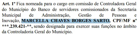 A nomeação foi publicada na edição desta segunda-feira, 2, do Diário Oficial do Município. Até então, Marcella Sarto atuava como gerente de Educação Cidadã na Controladoria-Geral do Estado (CGE-GO).