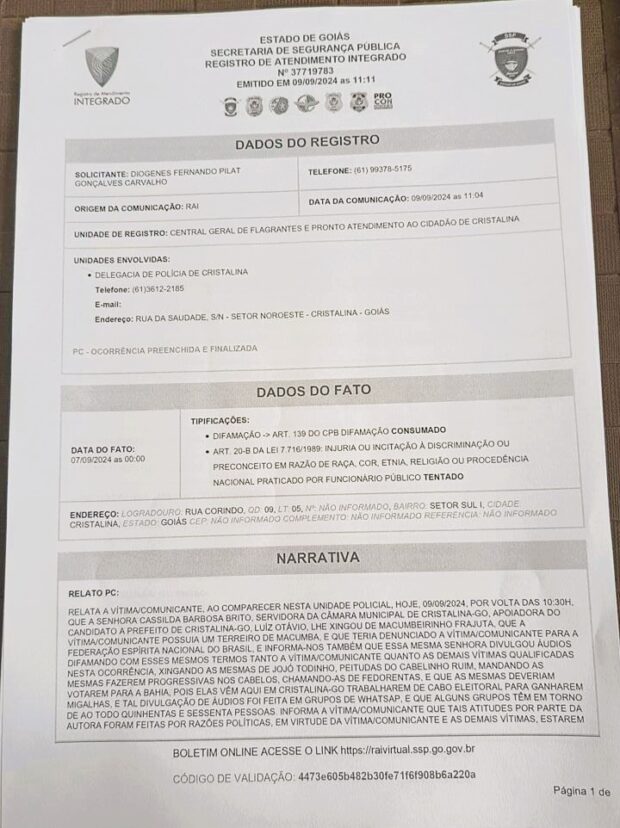 O boletim de ocorrência registrado contra Cacilda na manhã desta segunda-feira, 9, acusa os crimes de difamação, injúria ou incitação à discriminação ou preconceito. Veja documento abaixo.