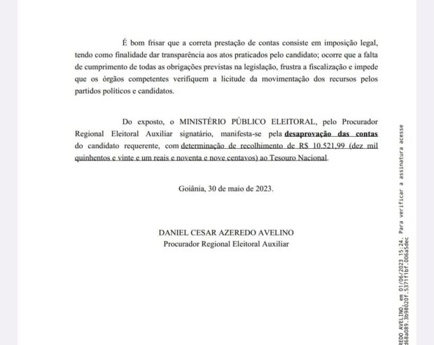 O relatório preliminar da Assessoria de Exame de Contas Eleitorais e Partidárias do MPE apontou sete irregularidades na prestação de contas de Igor Recelly Franco de Freitas – que também é alvo de pedido de cassação de seu mandato de vereador na Câmara de Goiânia. Além de recomendar a rejeição das contas do vereador, o procurador pede que seja aplicada multa ao parlamentar, no valor de R$ 10,5 mil.
