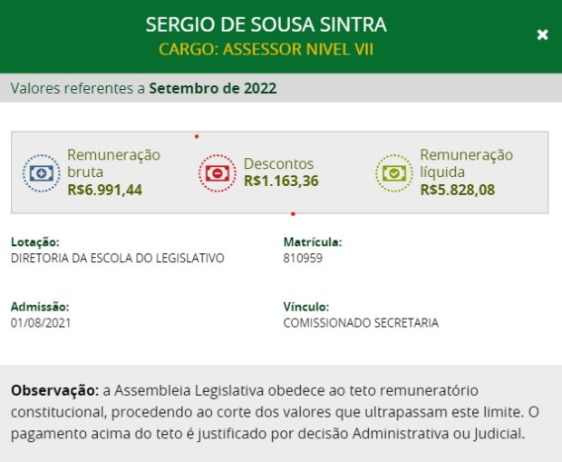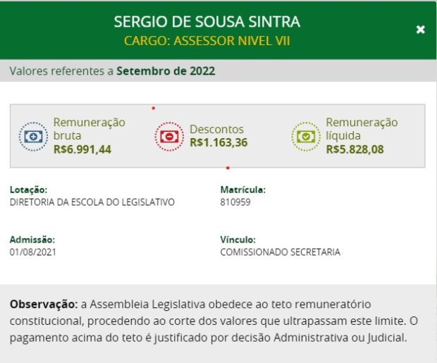 O salário mais alto é de Sérgio, com vencimento mensal de R$ 6.991,44. Já Esther possui um salário de R$ 5.957,20. O portal da transparência conta que Esther foi nomeada para o cargo no dia 01/05/2016. Sérgio, por outro lado, teria entrado no dia 01/08/2021.