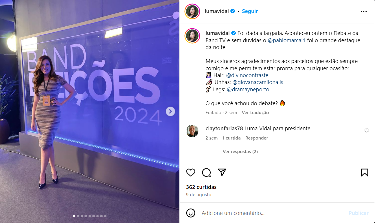 A atriz e publicitária Luma Vidal, assumiu a coordenação de comunicação de Marçal da campanha presidencial barrada de 2022. Ela teve passagens em novelas “A favorita”, “Tempos modernos”, Negócios da China” e “Passione” na Globo, onde também frequentava a plateia do o “Programa do Jô”; e “Dance, dance, dance” na Band.