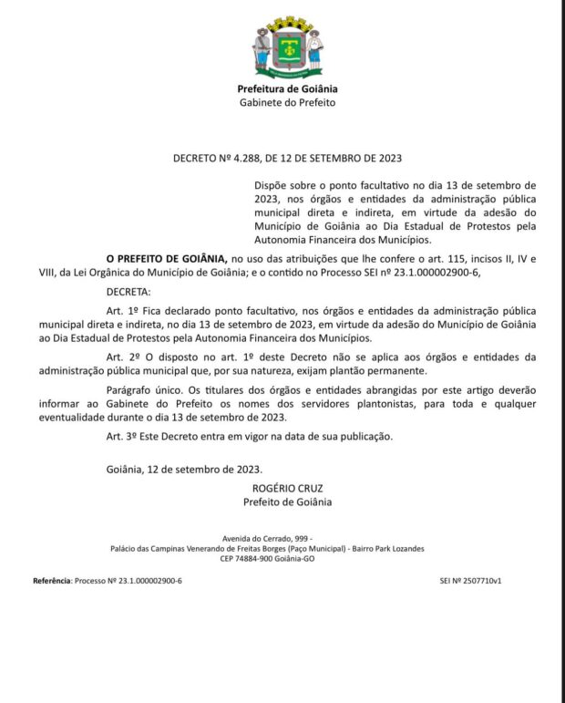 A Prefeitura de Goiânia decretou ponto facultativo nesta quarta-feira, 13, para os órgãos e entidades da administração pública. O motivo foi para aderir ao Dia Estadual de Protestos pela Autonomia Financeira dos Municípios, junto ao protesto que prefeitos goianos realizam na Assembleia Legislativo do Estado de Goiás. Com o ponto facultativo decretado, o Paço Municipal informou que a medida de paralisação não afetará órgãos e entidades que possuem plantão permanente.