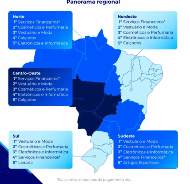 Esse padrão difere de outras regiões, como o Sudeste, onde artigos esportivos aparecem entre os mais vendidos, e o Sul, que destaca a categoria de livraria.