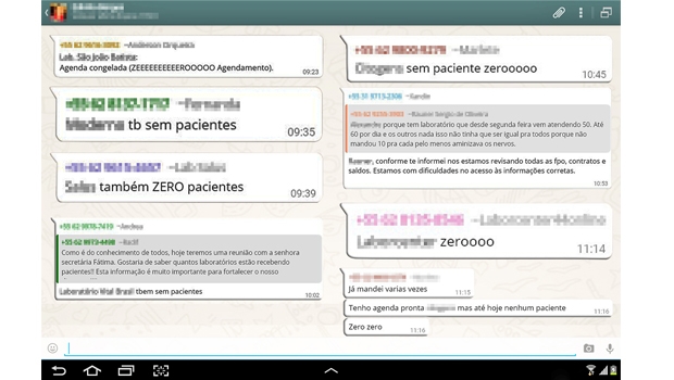 Além do suposto direcionamento de pacientes a apenas quatro unidades, o dono de outro laboratório conta no grupo que não recebeu o pagamento dos exames realizados na gestão do Paulo Garcia (PT). “Tenho faturas abertas desde outubro do ano passado. Paulo Garcia pagou 50% do valor, que estava há dois meses atrasado. Até hoje não pagaram e não tem previsão. Nós pagamos para trabalhar.”